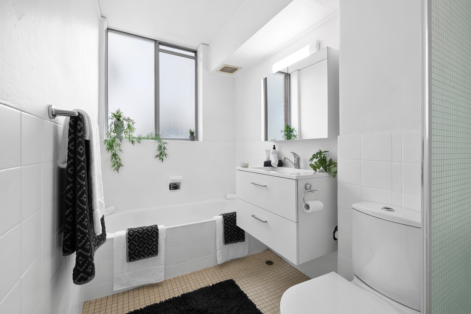 The bathroom retains its original layout but includes both a separate shower and bathtub, providing practicality for everyday living and future renovation potential.